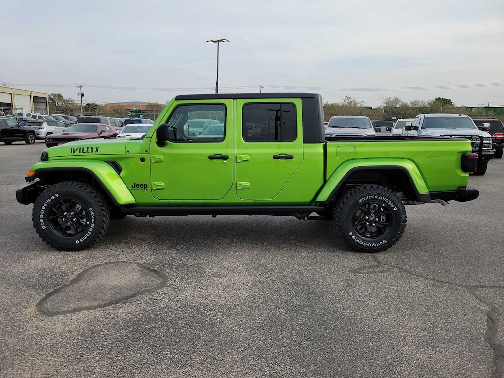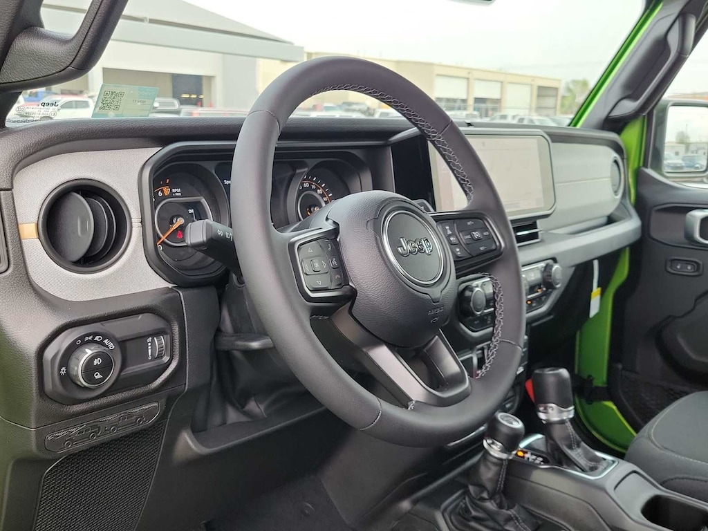 QUICK ORDER PACKAGE 24W WILLYS 3.6L V6 24V VVT UPG I Engine w/ESS, 8-Speed Automatic 850RE Transmission, LED Taillamps, Protection Sill Rails, 4-Wheel Drive Decal, Black Grille, Body Color Fender Flares (2-Piece), Front Heavy Duty Red Accent Shock Absorbers, Daytime Running Lamps LED Accents, Front LED Fog Lamps, LED Premium Reflector Headlamps, E-Locker Rear Axle, Corning Gorilla Glass, Trailer Hitch Zoom, Class IV Receiver Hitch, Security Alarm, Mold In Color Bumper w/Gloss Black, Advanced Brake Assist, Heavy Duty Engine Cooling, Automatic Headlamps, Air Conditioning w/Auto Temp Control, Deep Tint Sunscreen Windows, Off-Road Plus Mode, Willys Hood Decal, Full Speed Forward Collision Warning Plus, Rear Heavy Duty Red Accent Shock Absorbers, Front Door Locks 2-Door Passive Entry, Cluster, BLACK 3-PIECE HARD TOP Freedom Panel Storage Bag, Rear Window Defroster, Rear Sliding Window, SAFETY GROUP ParkSense Rear Park Assist System, Auto High Beam Headlamp Control, Blind Spot & Cross Path Detection, LED Taillamps, ALPINE PREMIUM AUDIO SYSTEM, TECHNOLOGY GROUP Media Hub w/2 Charge Only USBs, 400W Inverter, 115V Auxiliary Power Outlet, HD Radio, Connected Travel & Traffic Services, Rear View Auto Dim Mirror, Integrated Voice Command w/Bluetooth®, Uconnect 5 Nav w/12.3 Display, GPS Navigation, MOPAR SPRAY IN BEDLINER, 8-SPEED AUTOMATIC 850RE TRANSMISSION (STD), 3.6L V6 24V VVT UPG I ENGINE W/ESS (STD). Jeep Willys with Mojito exterior and Black interior features a V6 Cylinder Engine with 285 HP at 6400 RPM*.