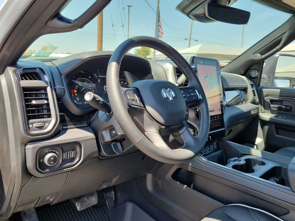 ENGINE: 6.7L I6 CUMMINS HO TURBO DIESEL Selective Catalytic Reduction (Urea), Dual 730 Amp Maintenance Free Batteries, Cummins Turbo Diesel Badge, Heavy Duty Engine Cooling, Diesel Exhaust Brake, Supplemental Heater, 3.42 Axle Ratio, Front Bumper Sight Shields, Fuel Tank Brush Guard, Capless Fuel Fill w/o Discriminator, GVWR: 11,040 lbs, REBEL LEVEL 2 EQUIPMENT GROUP Power Adjustable Pedals w/Memory, Front Passenger Interactive Display, Power Deployable Running Boards, MOPAR Deployable Bed Step, Premium Overhead Console, Leather Wrapped Shift Control, 17 Speaker harman/kardon® Premium Sound, LED Interior Lighting, LED Dome Lamp w/On/Off Switch, Universal Garage Door Opener, Sun Visors w/Illuminated Vanity Mirrors, CTR Stop Lamp w/Cargo View Camera, Rain Sensitive Windshield Wipers, LED Bed Lighting, Body Color Door Handles, Overhead LED Lamps, Auto Dim Exterior Mirror, Leather Wrapped Grab Handle, 14.4 Touchscreen Display, Power Heated Fold Telescopic Mirrors w/Memory, Sport Performance Hood, Radio: Uconnect 5 Nav w/14.4 Display, MOPAR Spray In Bedliner, Front Door Locks 2-Door Passive Entry, Auto High Beam Headlamp, SAFETY GROUP Active Lane Management System, Auto High Beam Headlamp Control, Rain Sensitive Windshield Wipers, Drowsy Driver Detection, Traffic Sign Recognition, Adaptive Steering System, AUTO LEVEL REAR AIR SUSPENSION, POWER SUNROOF, TRANSMISSION: 8-SPEED TORQUEFLITE HD AUTOMATIC. Ram Rebel with Bright White Clearcoat exterior and Black interior features a Straight 6 Cylinder Engine with 430 HP at 2800 RPM*.