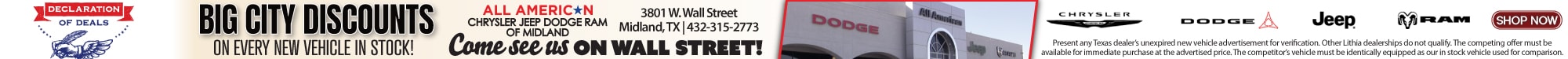 All American Chrysler Jeep Dodge of Midland provides the residents of Midland, TX and surrounding areas with up to date inventories of new and pre-owned Chrysler, Dodge and Jeep vehicles. But that isnt all youll find! Our responsive staff can help you with financial matters, service your car, order OEM auto parts and more! We have the knowledge and experience to ensure you quality service. Come visit us today at 3801 W Wall St or call us.