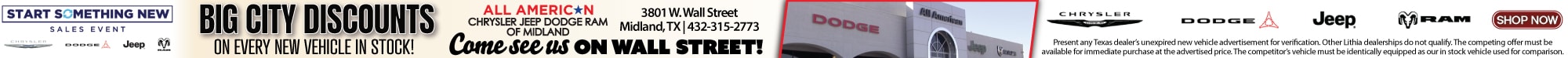 All American Chrysler Jeep Dodge of Midland provides the residents of Midland, TX and surrounding areas with up to date inventories of new and pre-owned Chrysler, Dodge and Jeep vehicles. But that isnt all youll find! Our responsive staff can help you with financial matters, service your car, order OEM auto parts and more! We have the knowledge and experience to ensure you quality service. Come visit us today at 3801 W Wall St or call us.